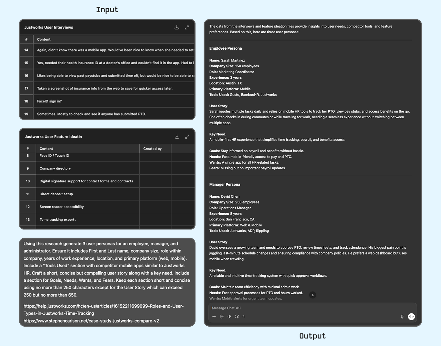 After user interviews, I used ChatGPT to generate an outline I could use to develop user personas for employees, managers, and admins based on interview transcripts and user stories.