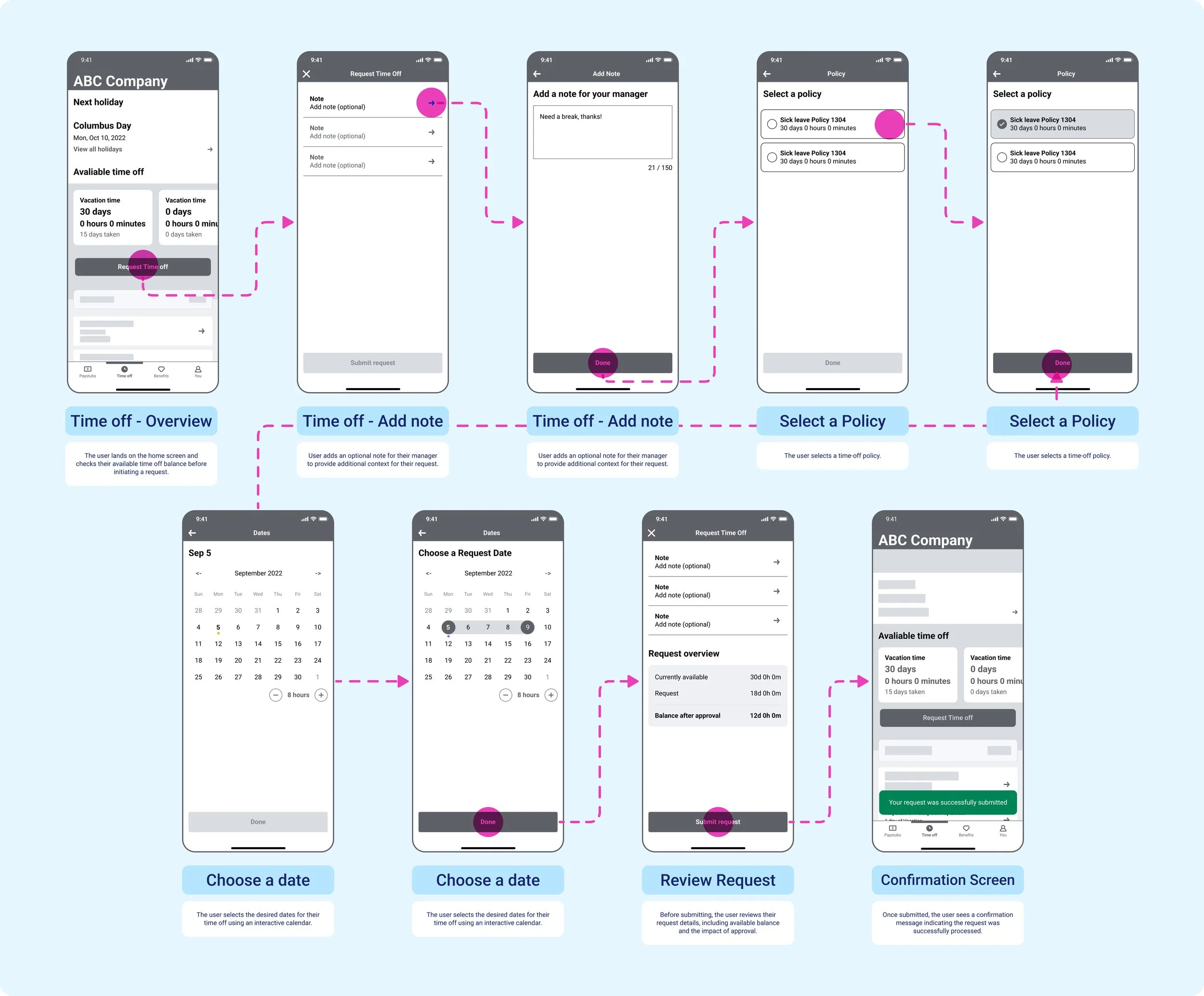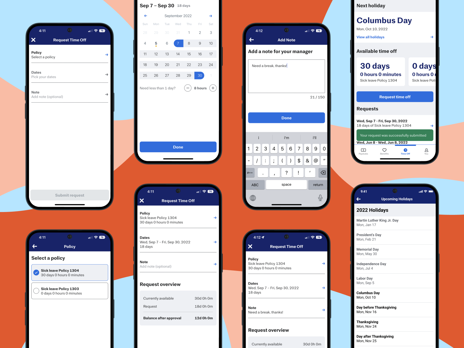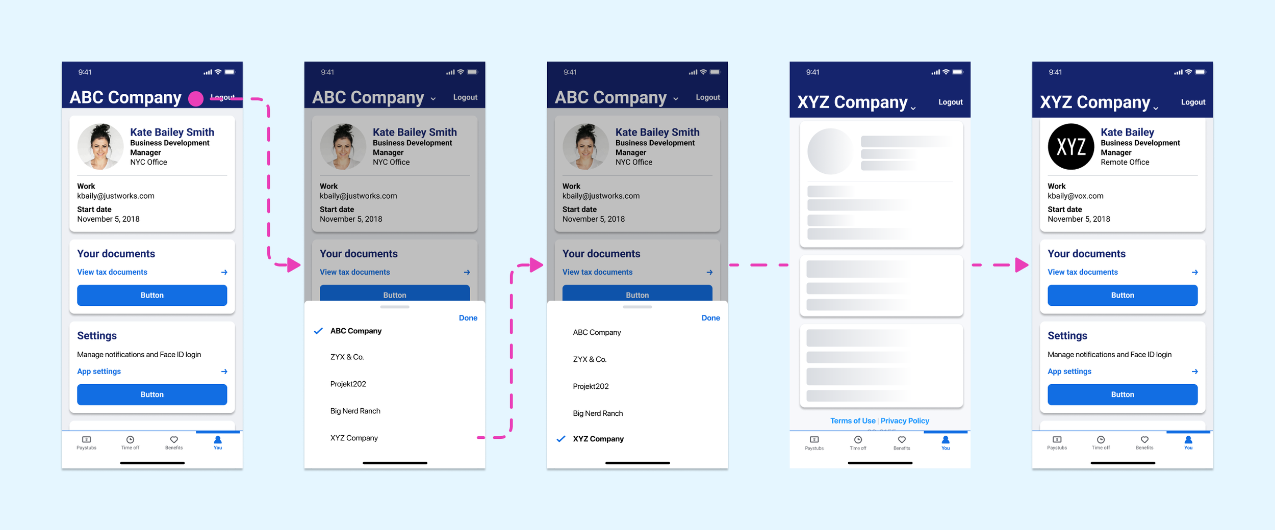 With the insights and tools to create a mobile experience that met users’ needs, the product designer and I embarked on a rapid design and prototyping process. We wireframed, prototyped, tested, and iterated. I created low-fidelity designs, wireframes, and prototypes for new user flows such as onboarding, submitting time-off requests, and switching accounts, and explored options for truncating and masking sensitive user data.