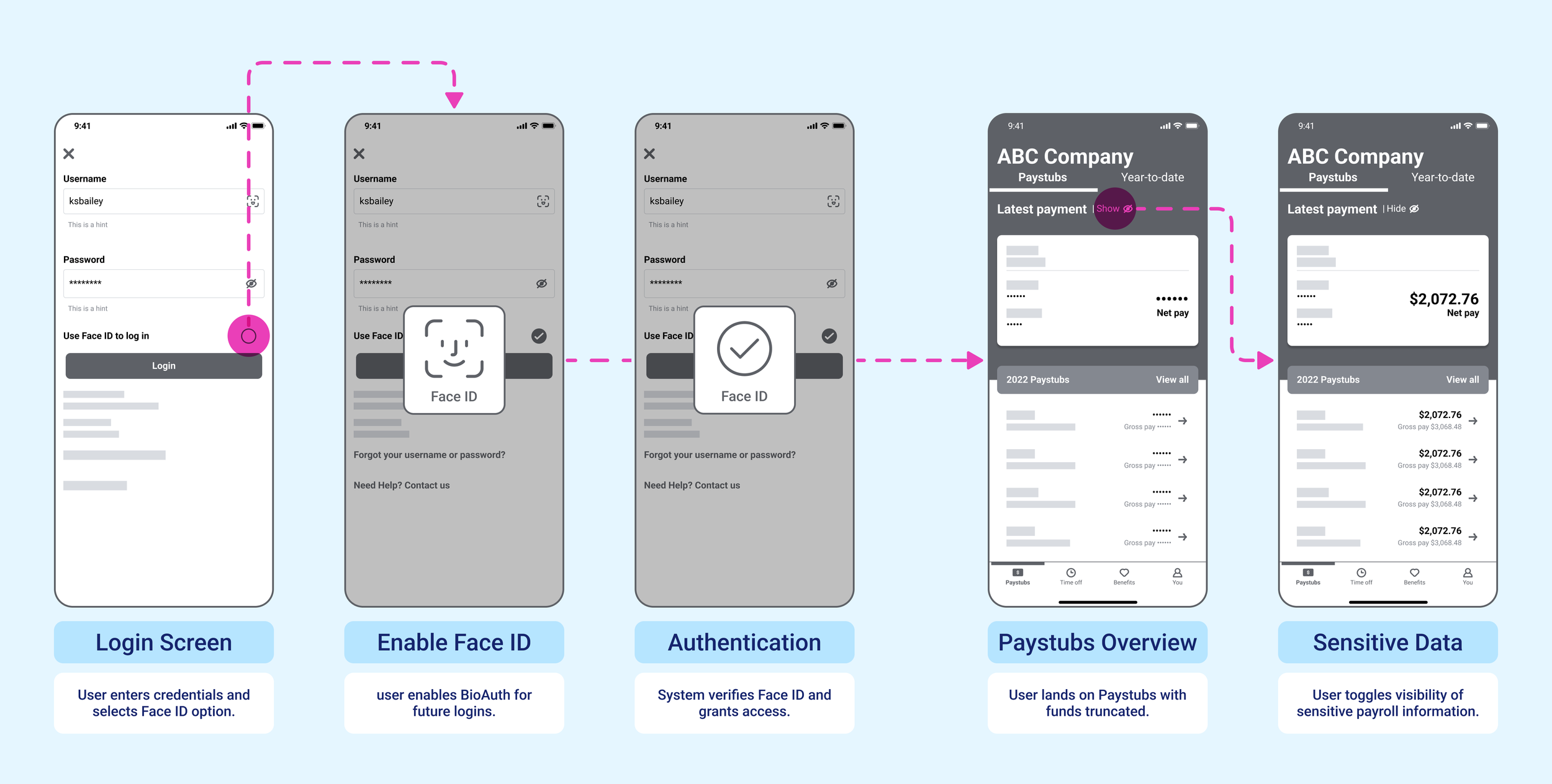 Sensitive payroll information is now masked upon login. Biometric authentication improved security while streamlining access.