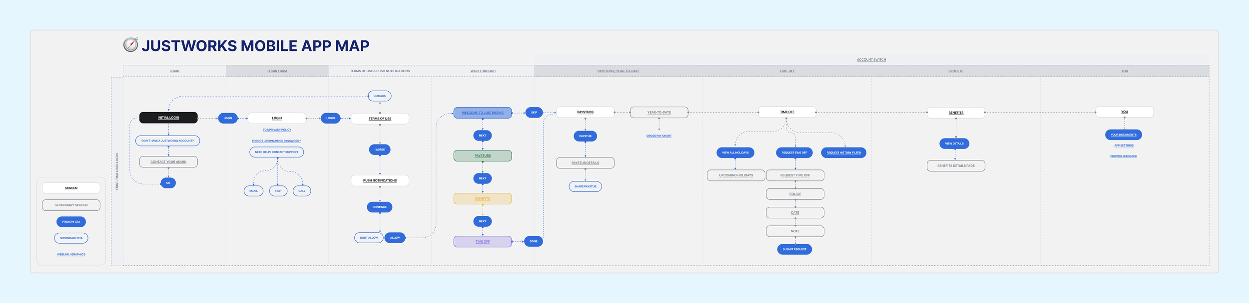 To begin this design journey, I immersed myself in Justworks’ mobile experience and the decisions that shaped its beta launch. I wanted to understand if any prior assumptions had influenced the beta released and why those assumptions led to adoption and usability challenges. Naturally. Every product team has assumptions and while some may hold up, some get absolutely roasted once users get their hands on the product!