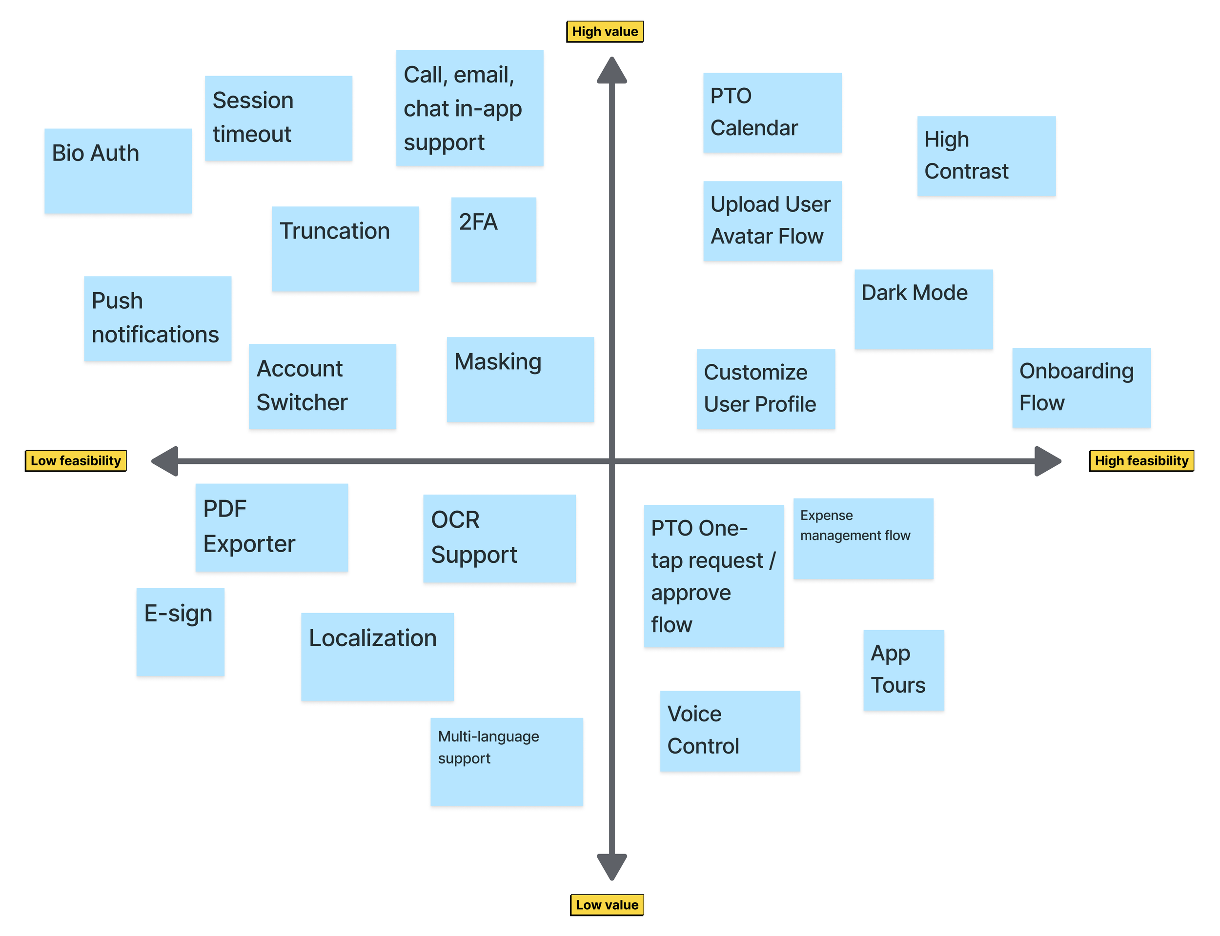 After the workshop, the product designer and I conducted a card-sorting exercise to organize and clarify the proposed features. We mapped each feature onto a feasibility-versus-value matrix, which helped us highlight “quick wins” and postpone more complex or lower-impact items for subsequent iterations.