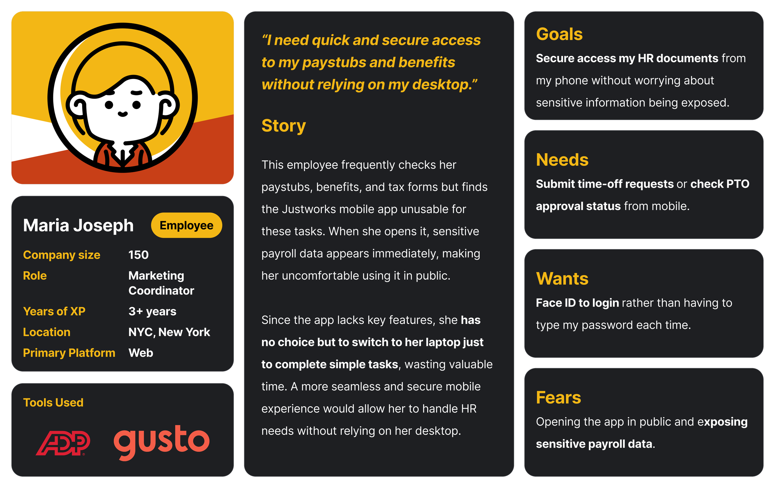 After synthesizing our research findings, we identified key user pain points and translated them into user needs statements. Administrators needed a seamless way to manage multiple teams remotely, managers required efficient approval workflows, and employees sought secure, mobile-friendly access to HR documents, benefits, and time-off requests.