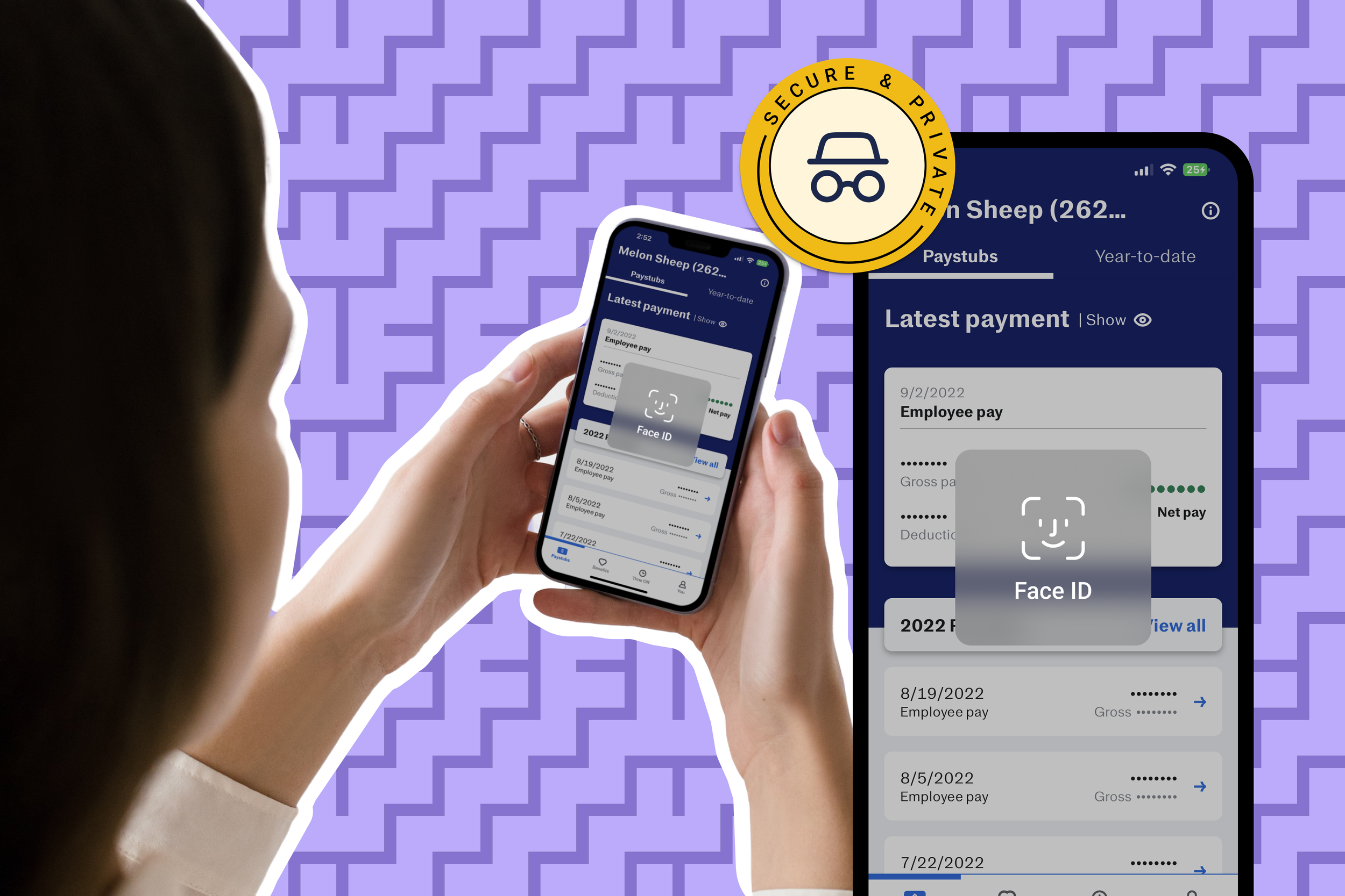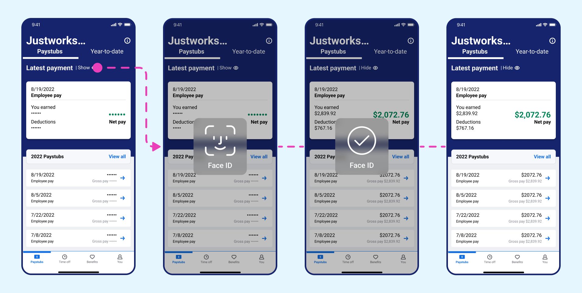 Sensitive information such as paystubs are now hidden by default and can be revealed using a Show / Hide toggle and their native biometric authentication method.